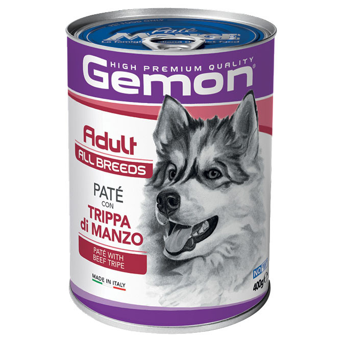 این محصول غذای سگ Gemon مدل Adult All Breeds Paté with Beef Tripe (پاته با سیرابی گاو) است.